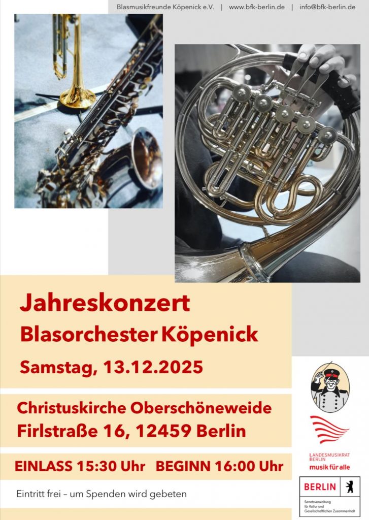Unser gemeinnütziger eingetragener Verein wurde 1991 gegründet und ist ein Zuhause für aktuell drei aktive Formationen, die Bigband Köpenick (BBK), das Blasorchester Köpenick (BOK) und das Schalmeienorchester Köpenick (SOK).