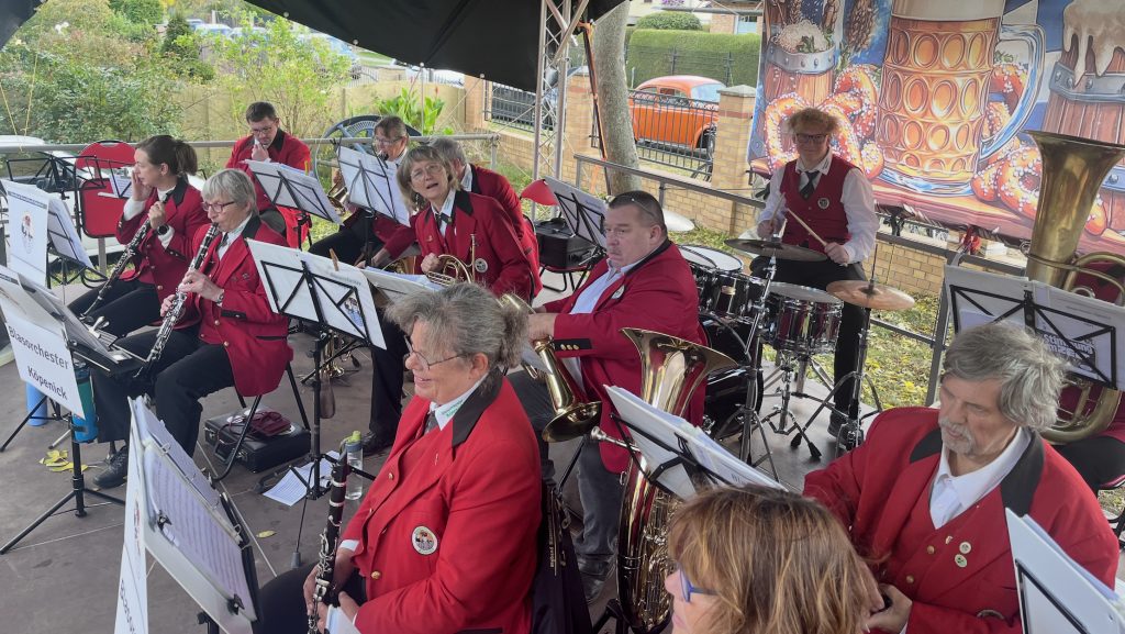 Nicht nur in München geht es auf die Wies’n, sondern zeitgleich am 20.09.2025 auch in Alt-Schönefeld auf dem Dorfanger. Und was ist ein solches Ereignis ohne zünftige Blasmusik? Dazu wurden wir vom Veranstalter eingeladen. Speziell dafür haben wir auch mal wieder unsere blauen und roten Hefte mitgenommen, die unter dem Titel „Stimmung im Zelt“ passende Stücke bereithalten. Das Wetter hat es mit uns leider etwas zu gut gemeint. Bei fast 30 Grad sind wir in der ersten Stunde ganz schön ins Schwitzen gekommen. Aber mit stimmungsvoller Musik ging sie schnell vorbei. Eine kleine Pause gab es beim offiziellen Fassbieranstich. Dann hieß es “O’zapft is!” und danach gab es noch einmal eine Stunde Musik von uns. Die Stimmung war super. Ab und an spielten wir ein Prosit der Gemütlichkeit – da wurde kräftig mitgesungen. Wir hoffen, den Oktoberfestbesuchern hat die Livemusik gut gefallen.