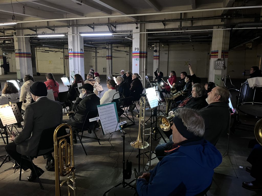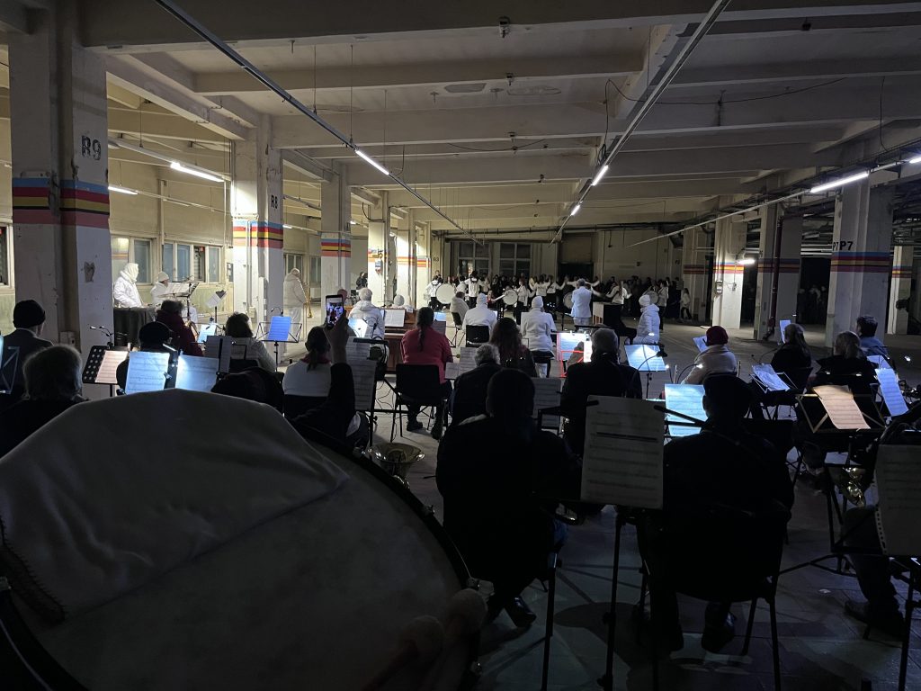 Mitte November 2025 war es wieder einmal so weit. Unser geschätzter Dirigent, Vicente Larrañaga, hatte unser Blasorchester und das Blasorchester HASTETÖNE Berlin zu einer ganz besonderen Auftrittsmöglichkeit im Rahmen einer Inszenierung der freien Opernkompanie NOVOFLOT eingeladen. In der Produktion „Die 5. Jahreszeit – Erste Berliner Karnevalshochburg“ wurde der ursprüngliche Karnevalsgedanke in Form von experimentellem Musiktheater neu interpretiert. Die außergewöhnliche künstlerische Darstellung erörterte dabei die Frage was Wahrheit in Zeiten permanenter Desinformation und einer unaufhörlichen Überflutung durch acht Milliarden Meinungsäußerungen pro Tag bedeuten kann. Beide Blasorchester waren dabei vor allem für einige Überraschungsmomente zuständig, die aus dem Hintergrund heraus aufgeführt wurden. So schufen wir beim Einlass der Gäste in die weitläufigen Hallen der ehemaligen OSRAM-Fabrik eine besondere Atmosphäre, indem wir heimlich im Dunkeln einen Auszug aus Bruckners 7. Sinfonie spielten. Auch zum Abschluss war der Überraschungsmoment auf unserer Seite. Wir spielten zunächst ein Teilstück aus Bruckners 8. Sinfonie hinter einer Wand, die dann ganz unerwartet abtransportiert wurde, sodass die Blasorchesterdarstellung zusammen mit den anderen Musikgruppen erklang. Auch bei der Uraufführung eines neuen Stücks von Michael Wertmüller, in dem extra ein Part für Blasorchester berücksichtigt wurde, durften beide Orchester mitwirken.