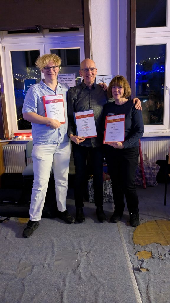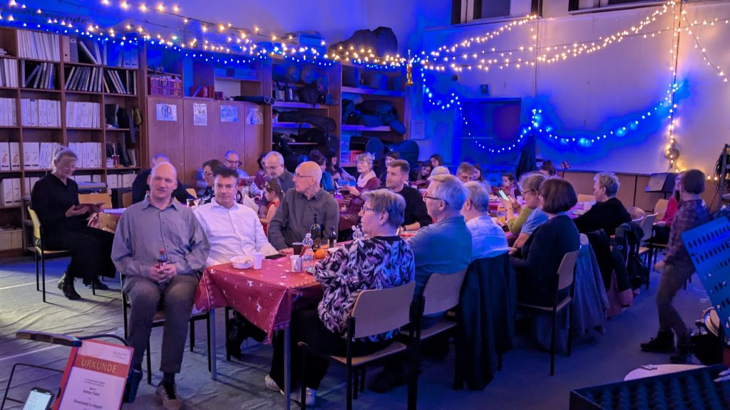 Nach dem Musizieren ging es zum gemeinsamen Ausklang des Tages auf unsere diesjährige Weihnachtsfeier im feierlich beleuchteten Probenraum. Die Weihnachtsfeier war insbesondere aus kulinarischer Sicht ein Highlight. Michael Bjarsch vom Wildhof Müncheberg, den wir zuletzt im Rahmen des Auftritt beim hofeigenen Fest Anfang März dieses Jahres begegnen konnten, löste sein Versprechen ein und verwöhnte uns mit Spezialitäten aus seinem Haus. Auch die Vereinsmitglieder bereicherten das vielfältige Buffet mit zahlreichen eigenen Köstlichkeiten, sodass keine kulinarischen Wünsche offenblieben. Nach dem Essen ging es mit einer von uns sehr geschätzten Tradition weiter. Für ihre Förderung der Musik wurden drei unserer Musiker*innen durch die Bundesvereinigung Deutscher Musikverbände e. V. (BDMV) geehrt. Für ihre jeweils 10-jährige Tätigkeit erhielten unsere Klarinettistin Anke und unser Schlagwerker Adrian die Ehrennadel in Altgold. Unser Posaunist Heiner wurde für seine 40-jährige Tätigkeit sogar mit der Ehrennadel in Gold mit Diamant ausgezeichnet. Herzlichen Glückwunsch und vielen Dank für eure Unterstützung bei der Förderung der Blasmusik! Da unser Adrian nicht nur zuverlässig Schlagzeug und Malletts spielt, sondern auch am Klavier sehr talentiert ist, bot er an, uns dieses Jahr beim traditionellen Singen von Weihnachtsliedern zu begleiten. Dieses Angebot nahmen wir gerne an, sodass wir den Abend beim gemeinsamen Musizieren ausklingen lassen konnten. Herzlichen Dank an alle Organisator*innen und Helfer*innen für den schönen gemeinsamen Abend!