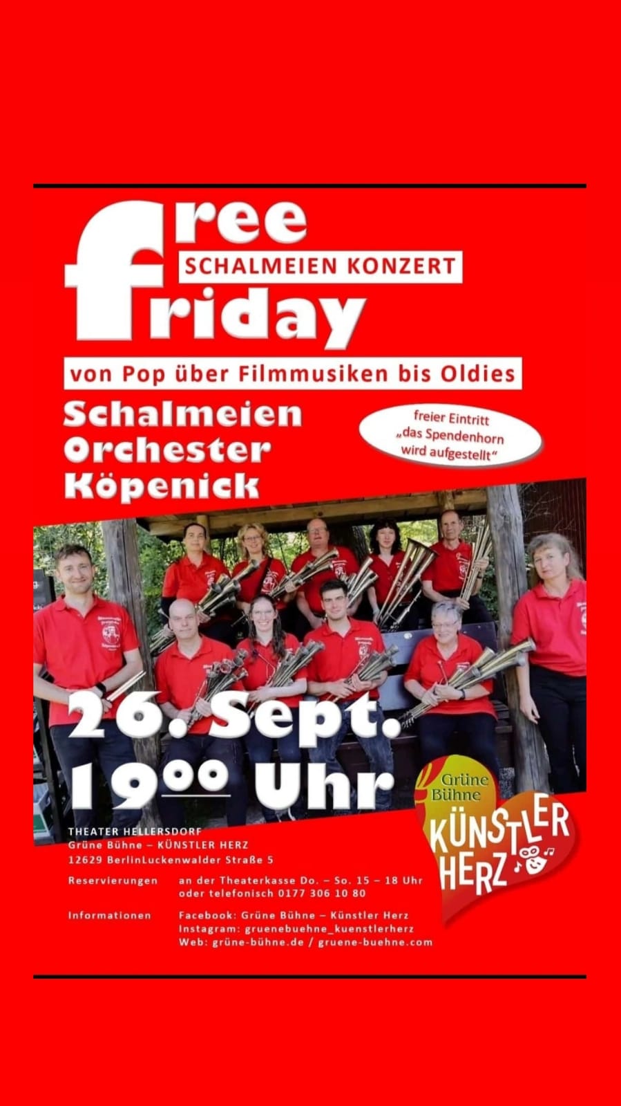 Die “Grüne Bühne” in Hellersdorf präsentiert unser “Schalmeienorchester Köpenick” zu seinem ersten eigenen Konzert! Seien Sie dabei, Reservierungen über die Theaterkasse oder telefonisch (0177/3061080), Internet: www.gruene-buehne.com